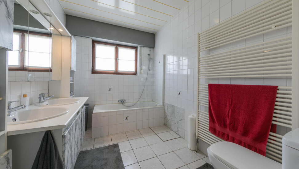 Entrance hall with cloakroom and guest toilet equipped with hand-washer. Spacious living room with cosy pellet stove that continues into the dining room and kitchen. The kitchen has its own breakfast corner and is fully equipped. Behind the kitchen is the very practical laundry room with fitted cupboards and access to the cellar. Also adjacent to the entrance hall are the 3 bedrooms and the bathroom. The bathroom has had a shower in the past, which can easily be restored. The attic can be accessed via a sliding staircase in the hallway.