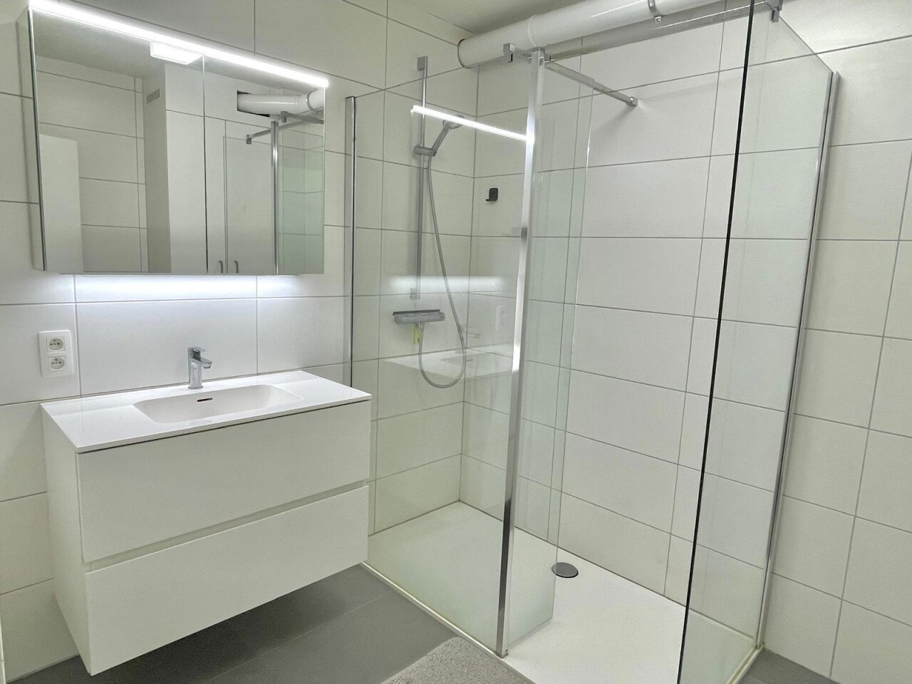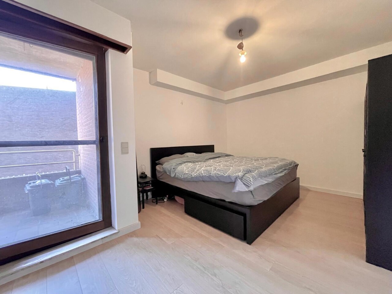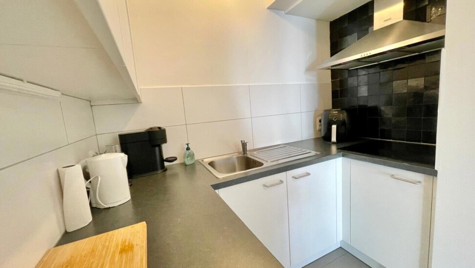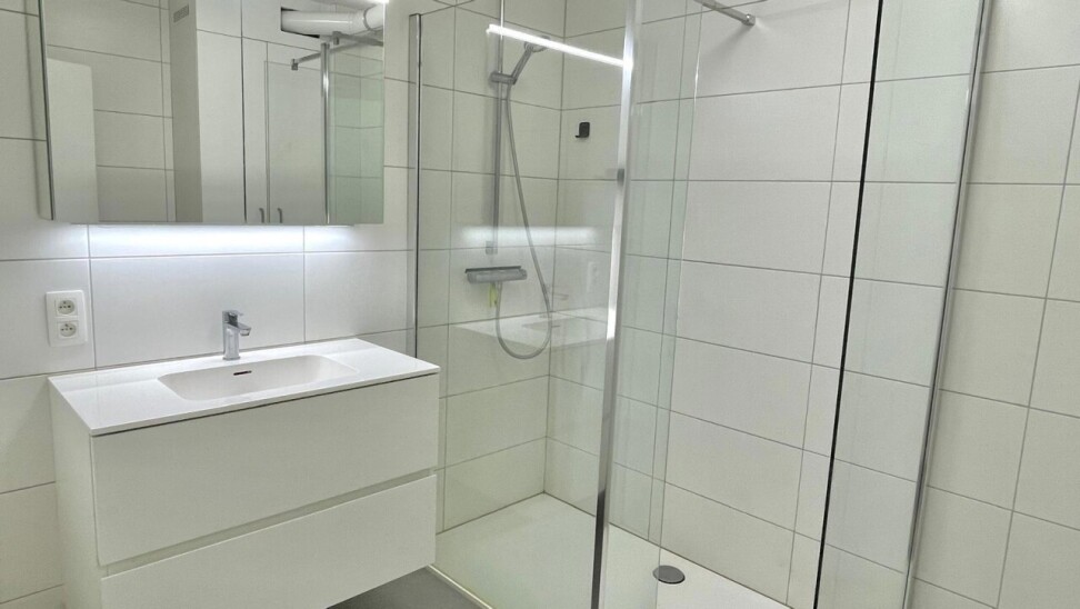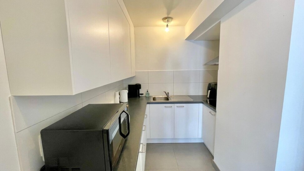 The flat also has a modern bathroom with a stylish walk-in shower and a practical washbasin unit. The spacious bedroom offers enough space for a comfortable double bed and extra cupboard space, and also gives direct access to the rear terrace where you can enjoy a moment of peace and quiet outside.