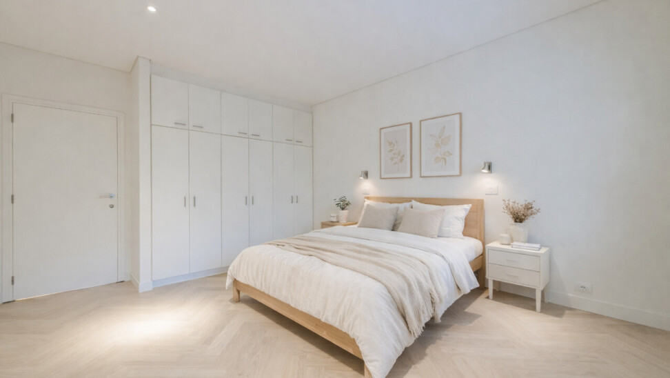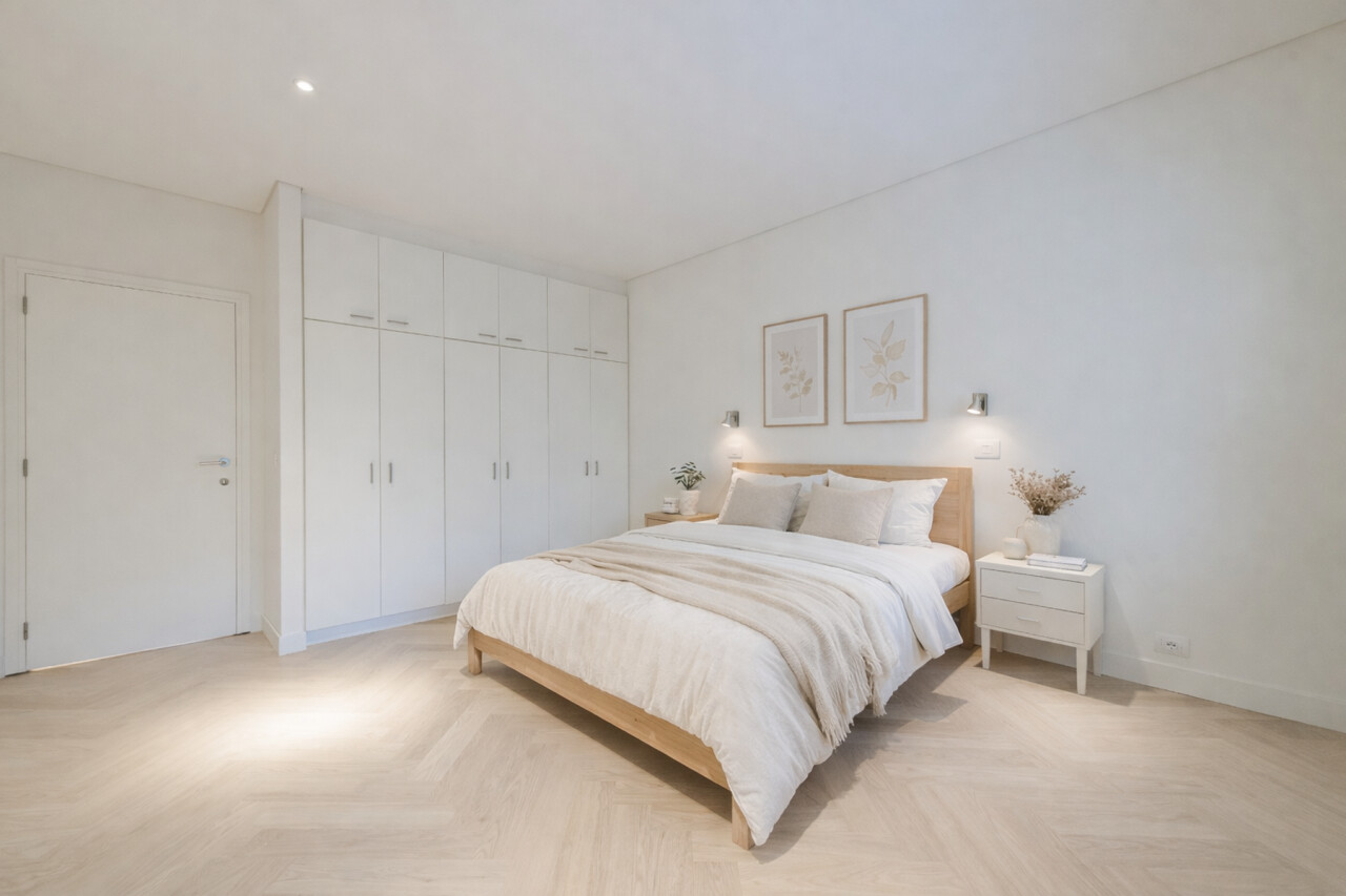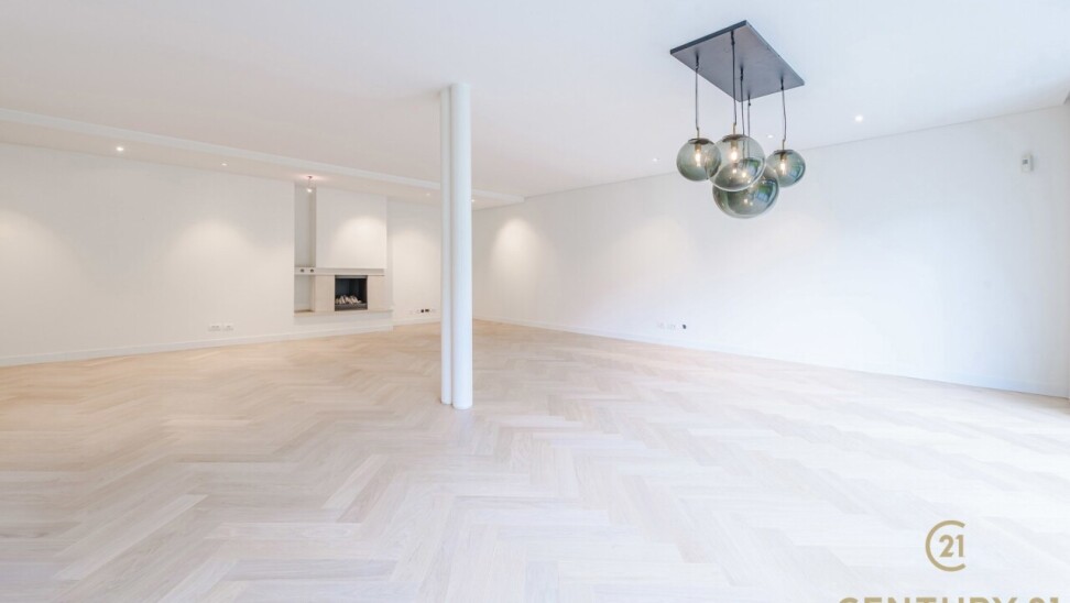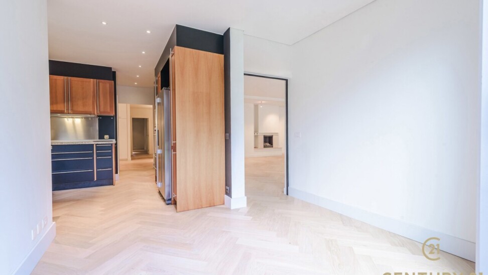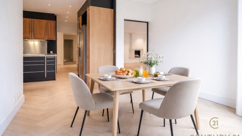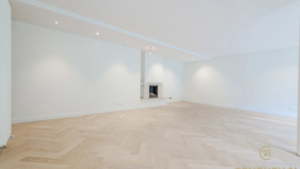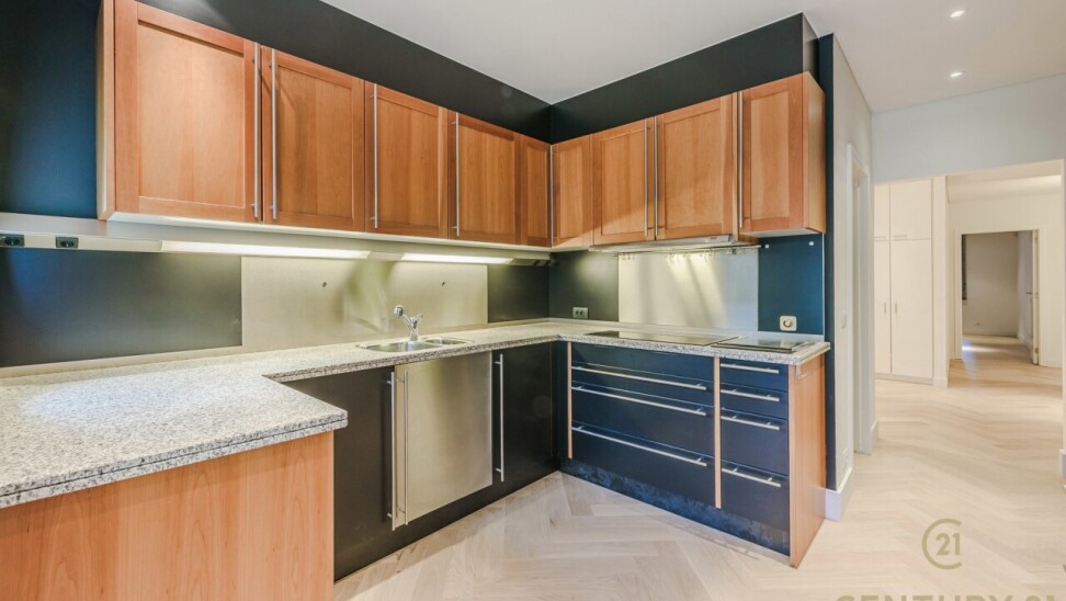 The entrance hall with cloakroom and guest toilet forms an elegant entrance. The spacious, open-plan living area connects seamlessly to the dining room and the fully equipped, modern kitchen – an inviting place for both intimate dinners and entertaining guests. In 2026, the flat was stylishly updated with solid oak herringbone parquet flooring, creating a warm and timeless look, and elegant steel and glass doors were installed between the living room and the kitchen, connecting light and space in a refined way.