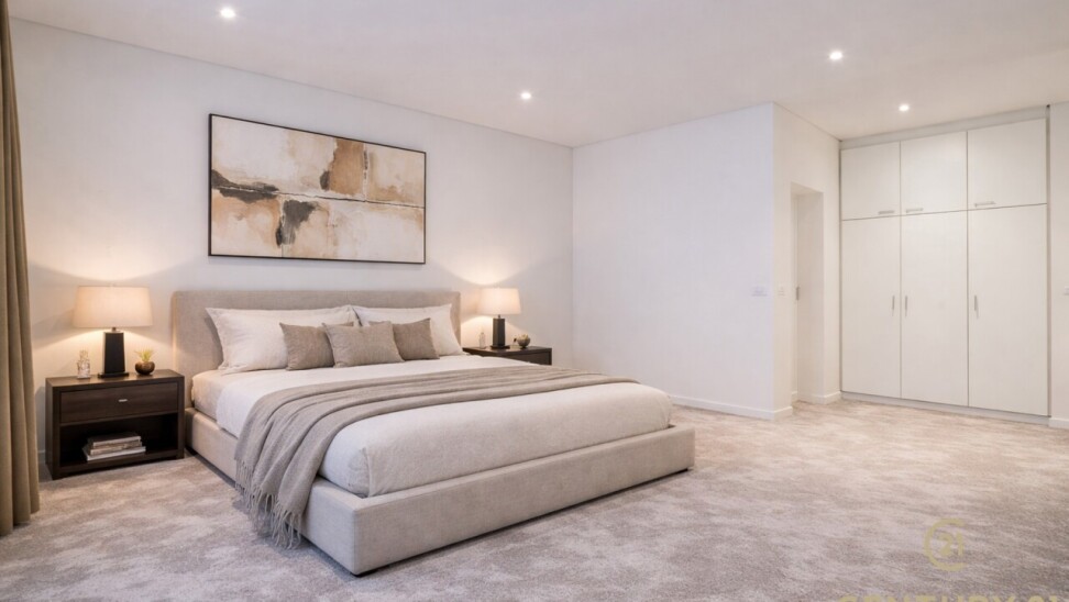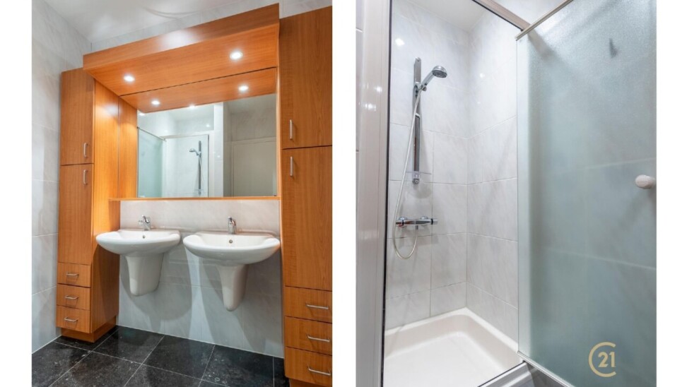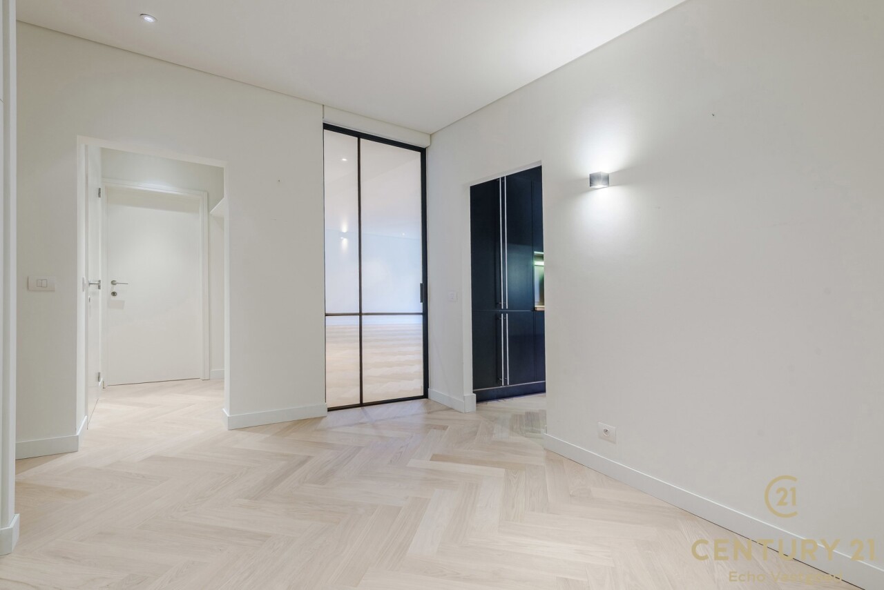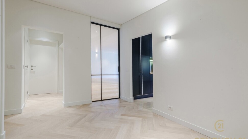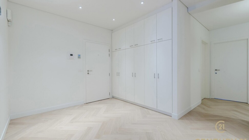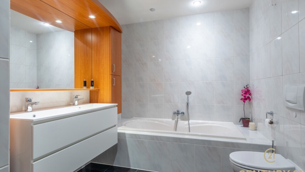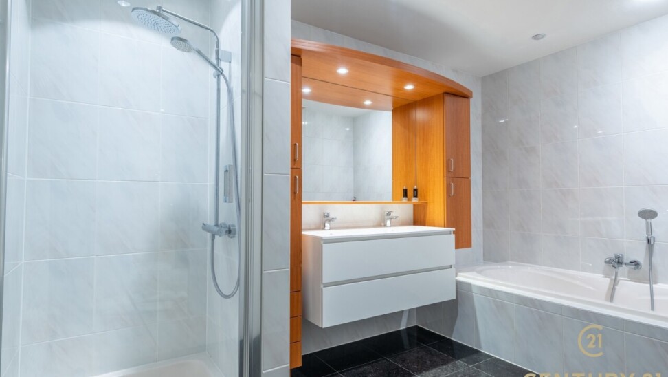 The flat has three full bedrooms, two of which have practical built-in wardrobes. The master bedroom has direct access to the luxurious bathroom, equipped with a bathtub, walk-in shower and double sink.