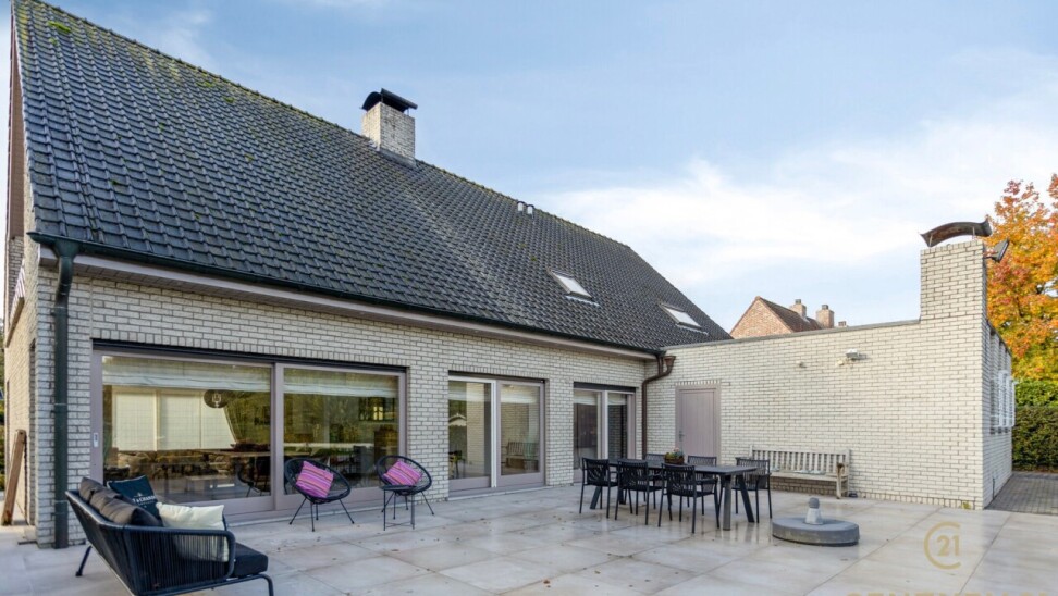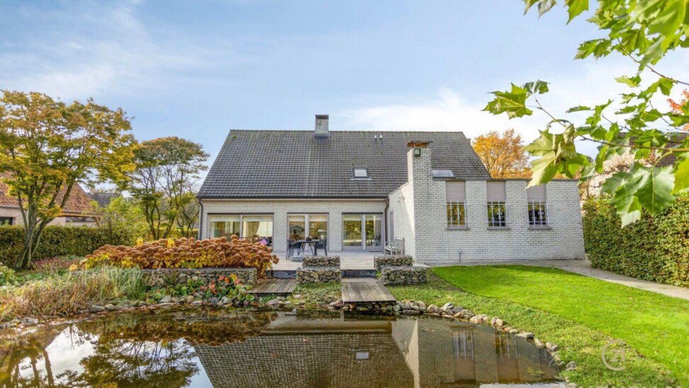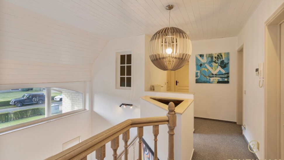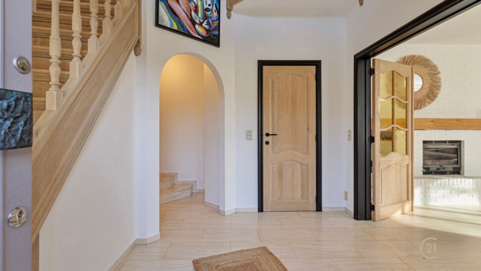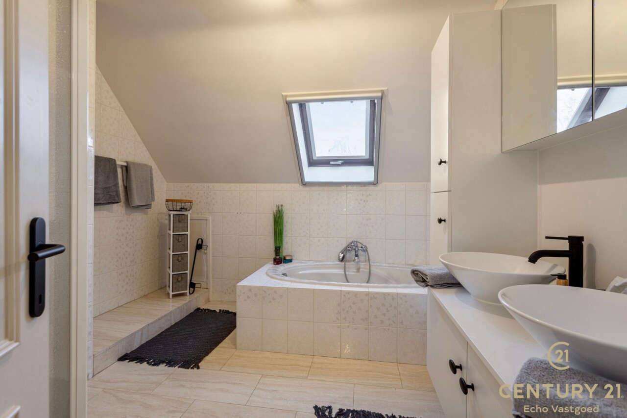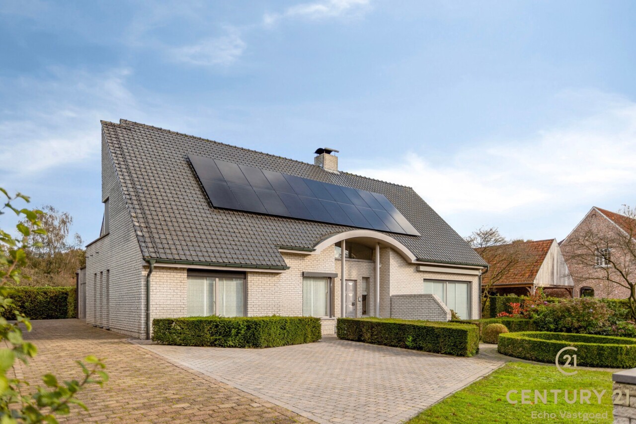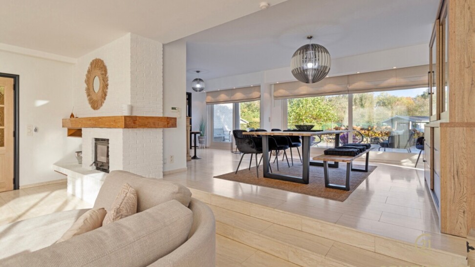 Through double oak doors you enter the spacious L-shaped living room on natural stone with underfloor heating, a cozy fireplace and a panoramic view of the landscaped garden and sun terrace. Installed kitchen with cozy breakfast nook, practical storage room with connection for washer and dryer. Night hall with practical fitted wardrobes, master bedroom, bathroom with bath, shower and double washbasin. Double indoor garage with automatic panel door.
