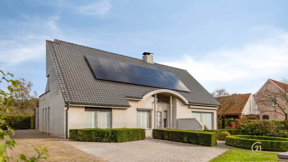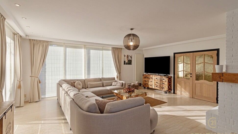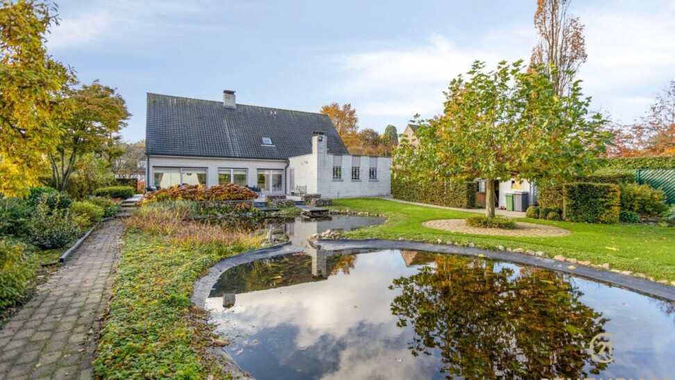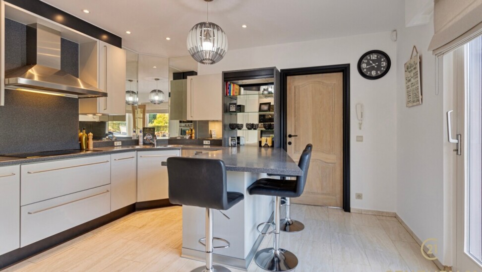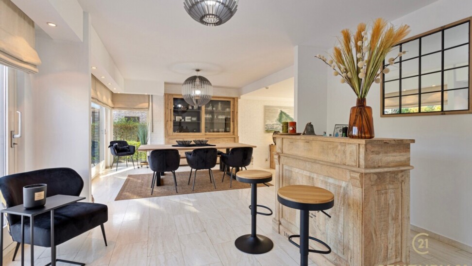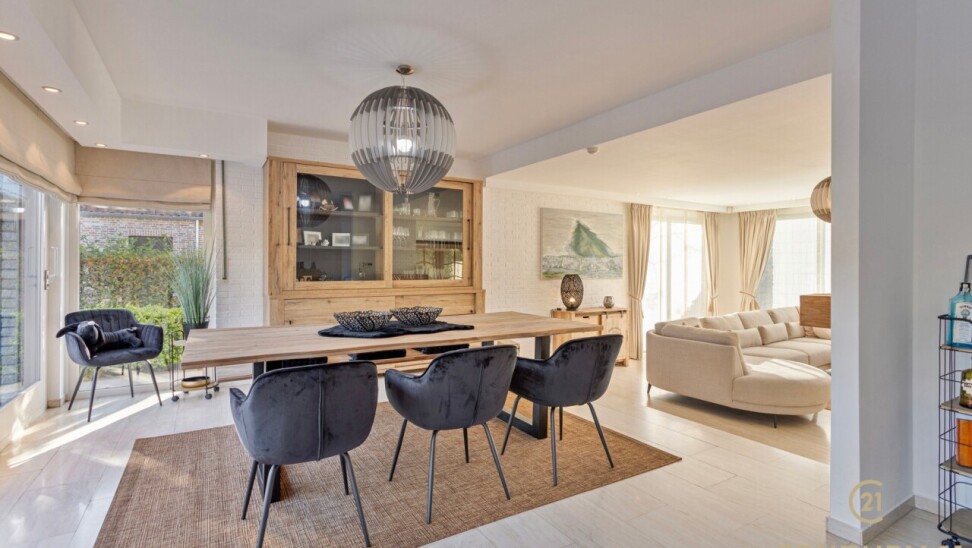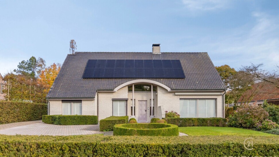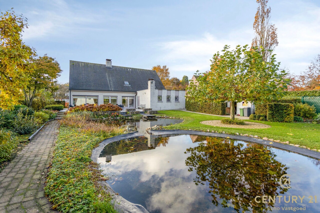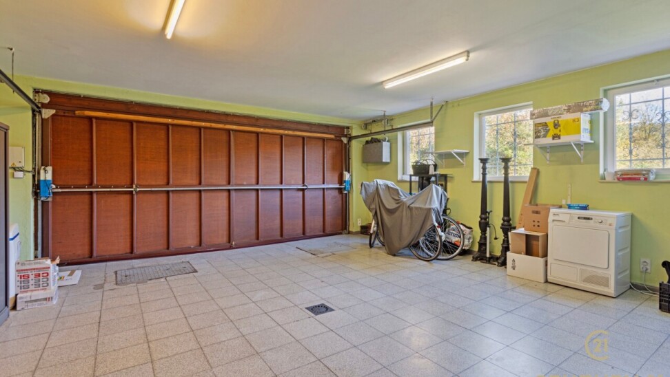 Through double oak doors you enter the spacious L-shaped living room on natural stone with underfloor heating, a cozy fireplace and a panoramic view of the landscaped garden and sun terrace. Installed kitchen with cozy breakfast nook, practical storage room with connection for washer and dryer. Night hall with practical fitted wardrobes, master bedroom, bathroom with bath, shower and double washbasin. Double indoor garage with automatic panel door.