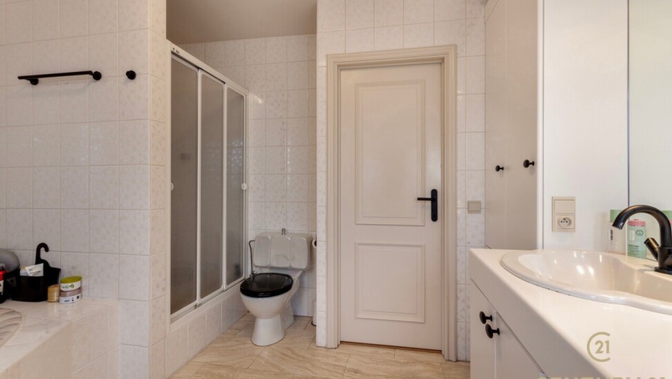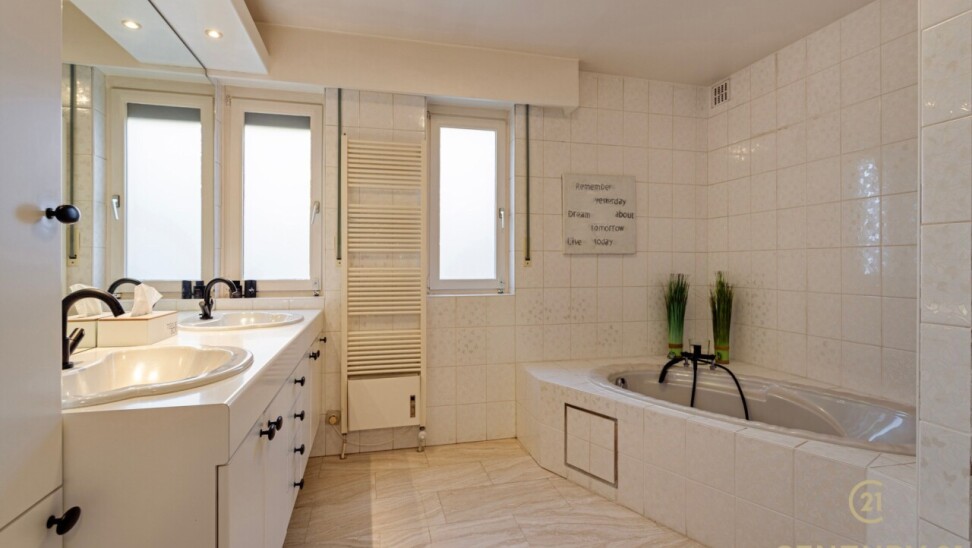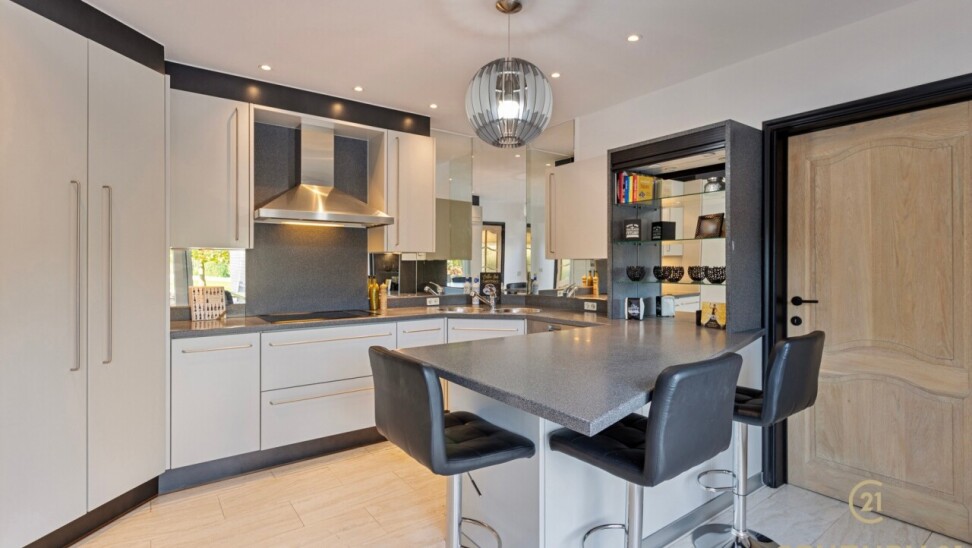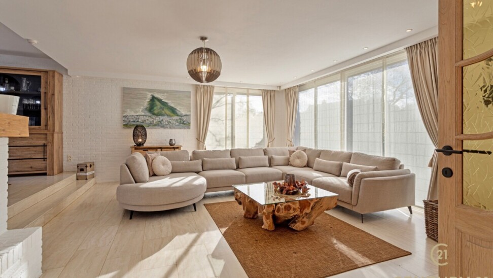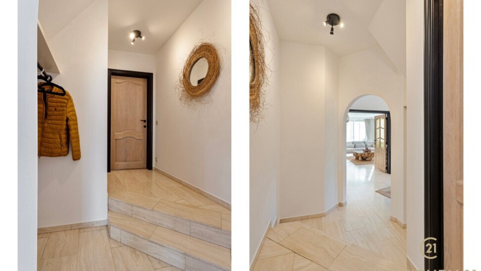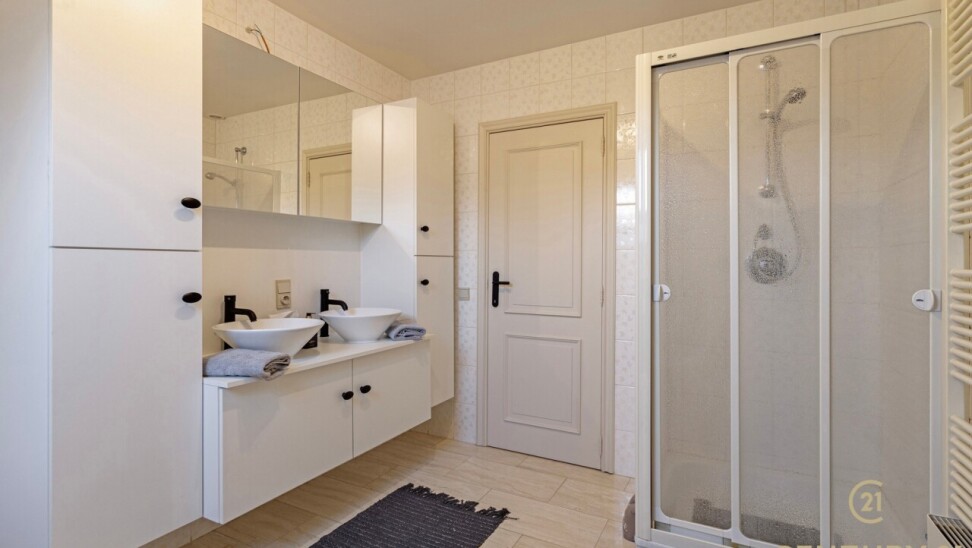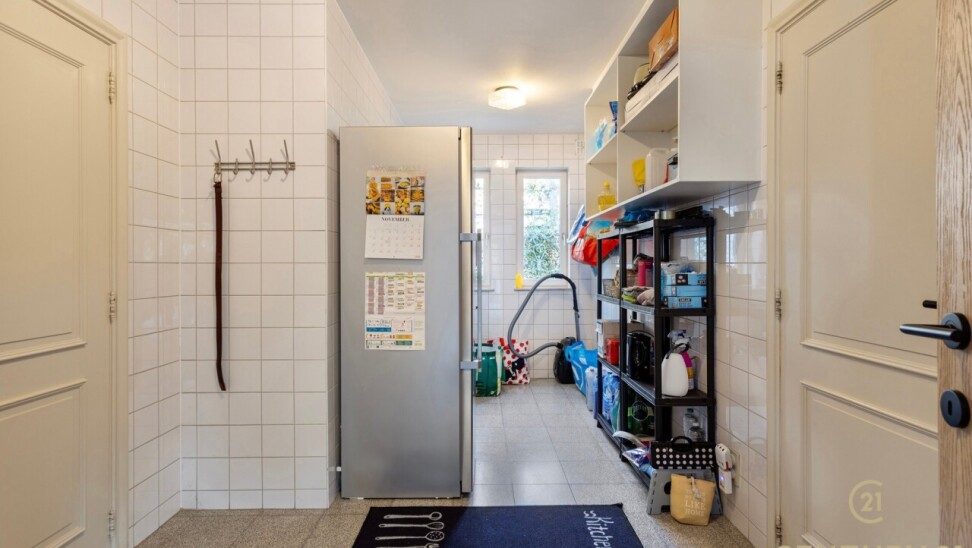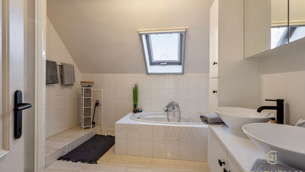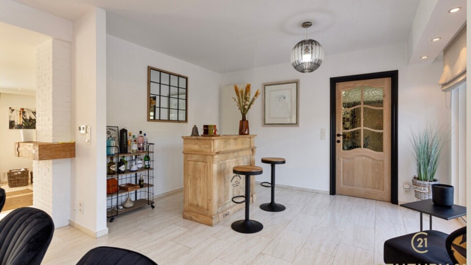 Through double oak doors you enter the spacious L-shaped living room on natural stone with underfloor heating, a cozy fireplace and a panoramic view of the landscaped garden and sun terrace. Installed kitchen with cozy breakfast nook, practical storage room with connection for washer and dryer. Night hall with practical fitted wardrobes, master bedroom, bathroom with bath, shower and double washbasin. Double indoor garage with automatic panel door.