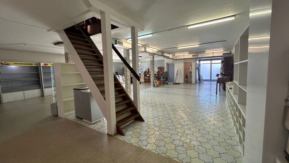 The ground floor space of approximately 140 m² is accessible from two sides, which makes loading and unloading particularly efficient. It is a spacious, open floor that currently still has shop shelving. In addition, there is a toilet on this floor, which makes daily operations even more practical.