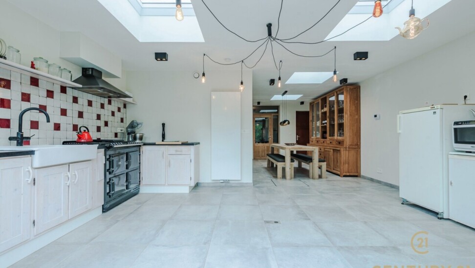 De keuken is een echte eyecatcher, met een stijlvolle afwerking en een indrukwekkend AGA-fornuis – voor kenners hét neusje van de zalm onder de fornuizen. Vanuit de keuken brengt een grote schuifraam u naar de ruime tuin, die uitnodigt voor gezellige tuinfeesten en beschikt over praktische bergruimtes achteraan. Bent u iemand met groene vingers? Dan is dit de plek om uw eigen groene paradijs te creëren!
