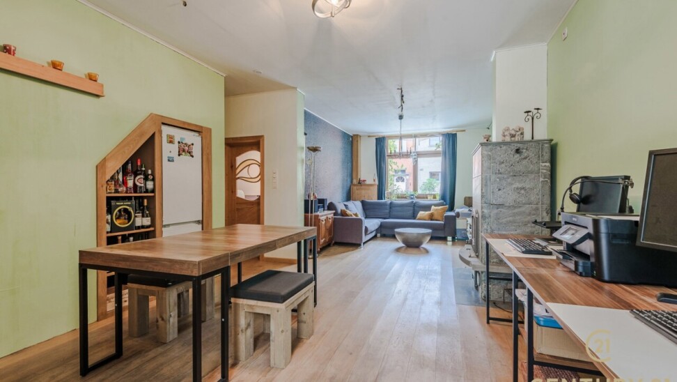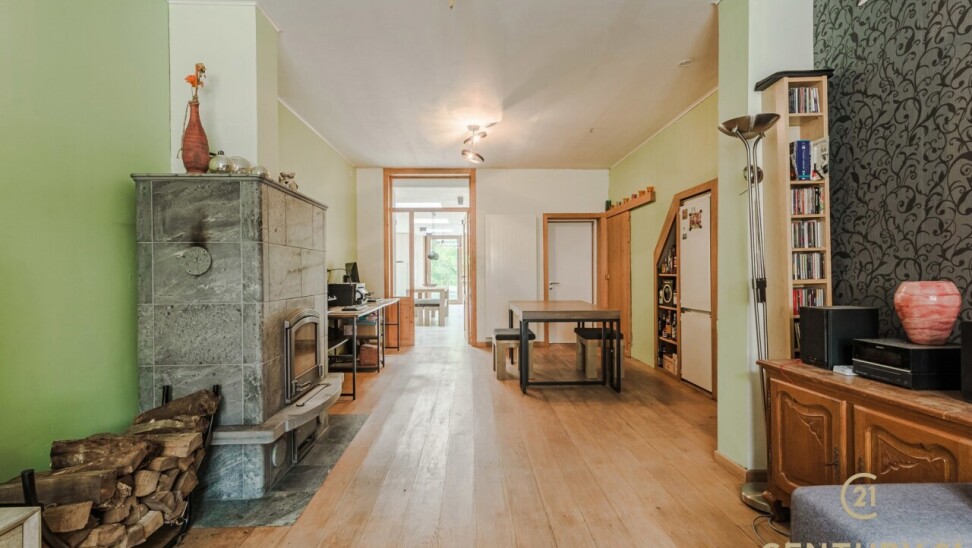 Bij het betreden van de woning wordt u verwelkomd in een authentieke inkomhal met originele tegelvloer en prachtige houten deuren. De woonkamer, voorzien van een warme houten vloer en een sfeervolle speksteenkachel, nodigt uit tot gezellige avonden in huiselijke sfeer.