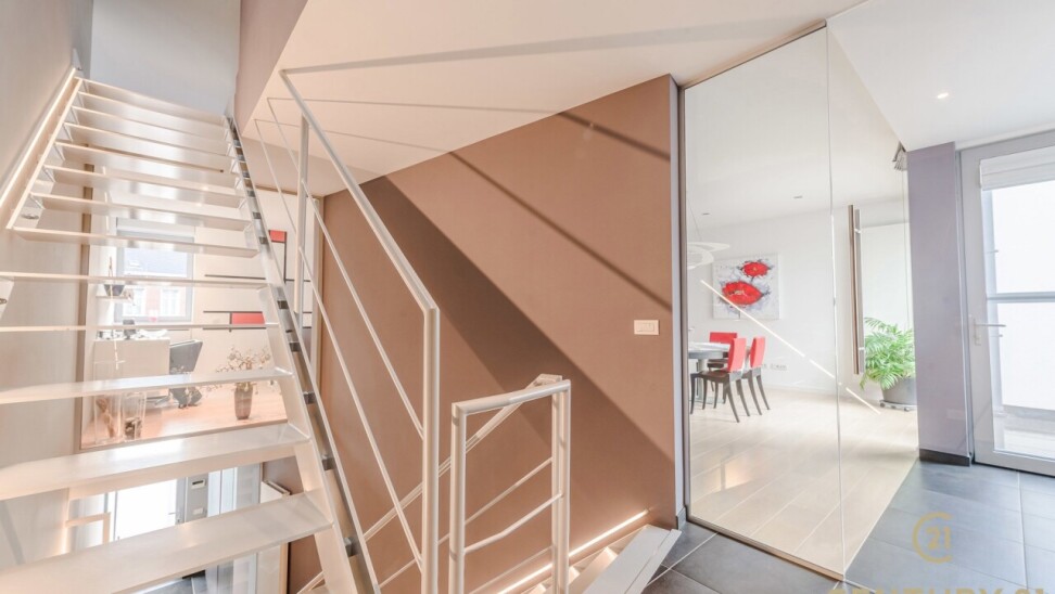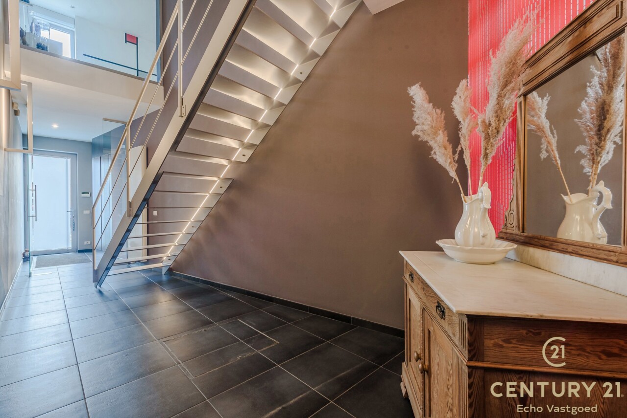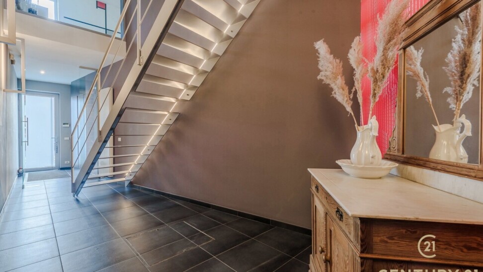 De woonst is bereikbaar via een eigen toegangsdeur en komt uit in de inkomhal met trap. Vanuit deze inkomhal heeft u eveneens toegang tot de fraaie tuin.