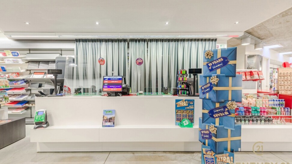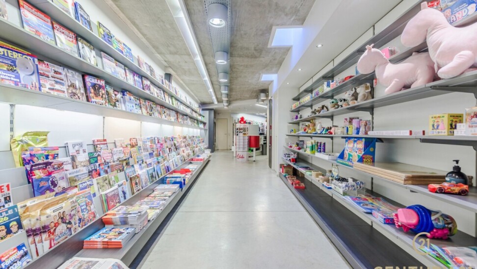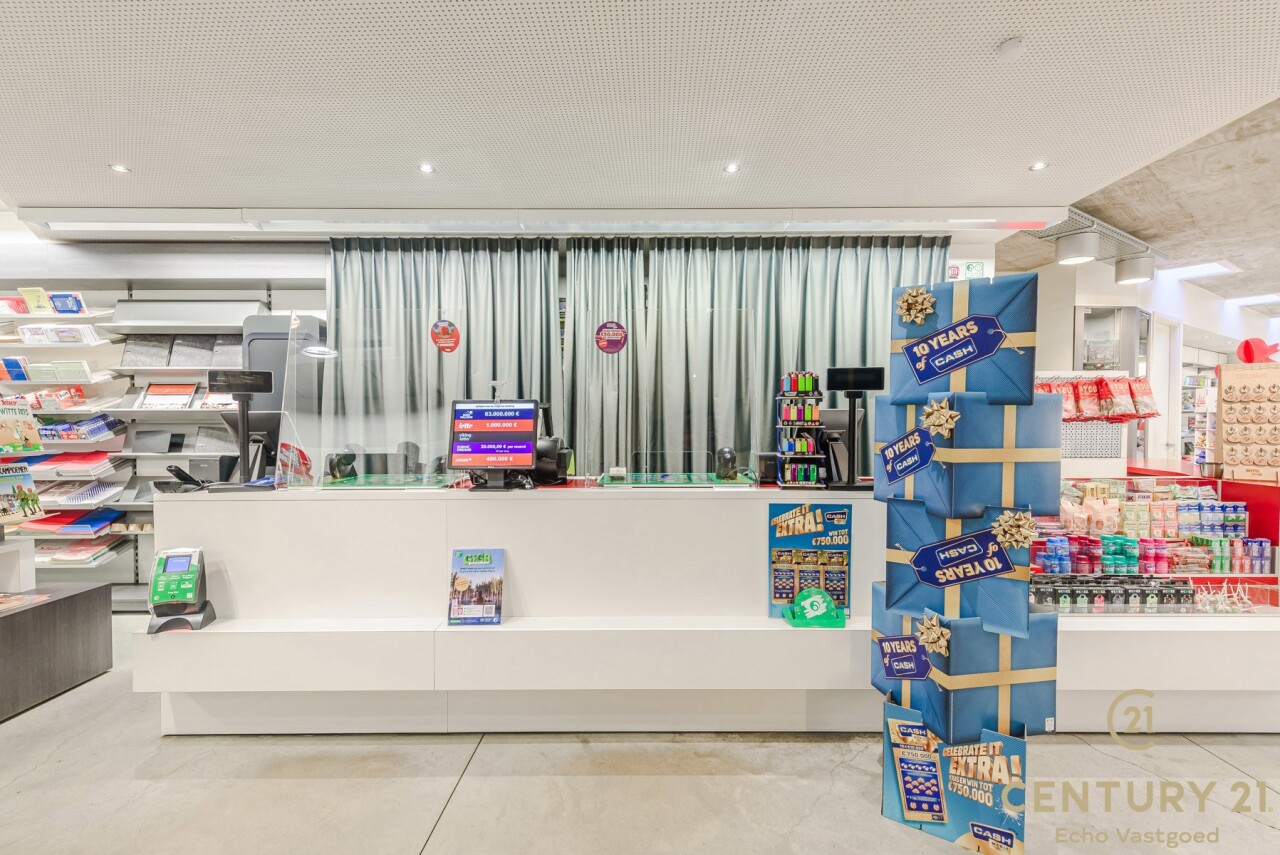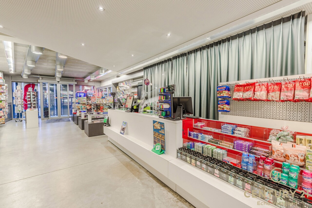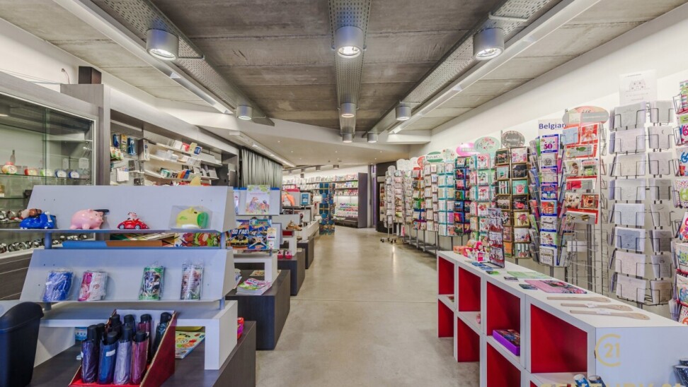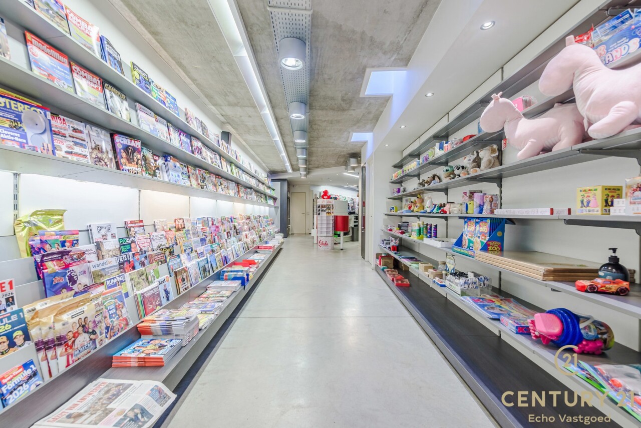 Op het gelijkvloers bevindt zich de handelsruimte, momenteel ingericht als dagbladhandel, maar perfect geschikt voor diverse commerciële activiteiten. De winkel beschikt over een vooringang langs de straatzijde, wat zorgt voor een vlotte en professionele toegang voor klanten, en een interne verbinding naar de woning.