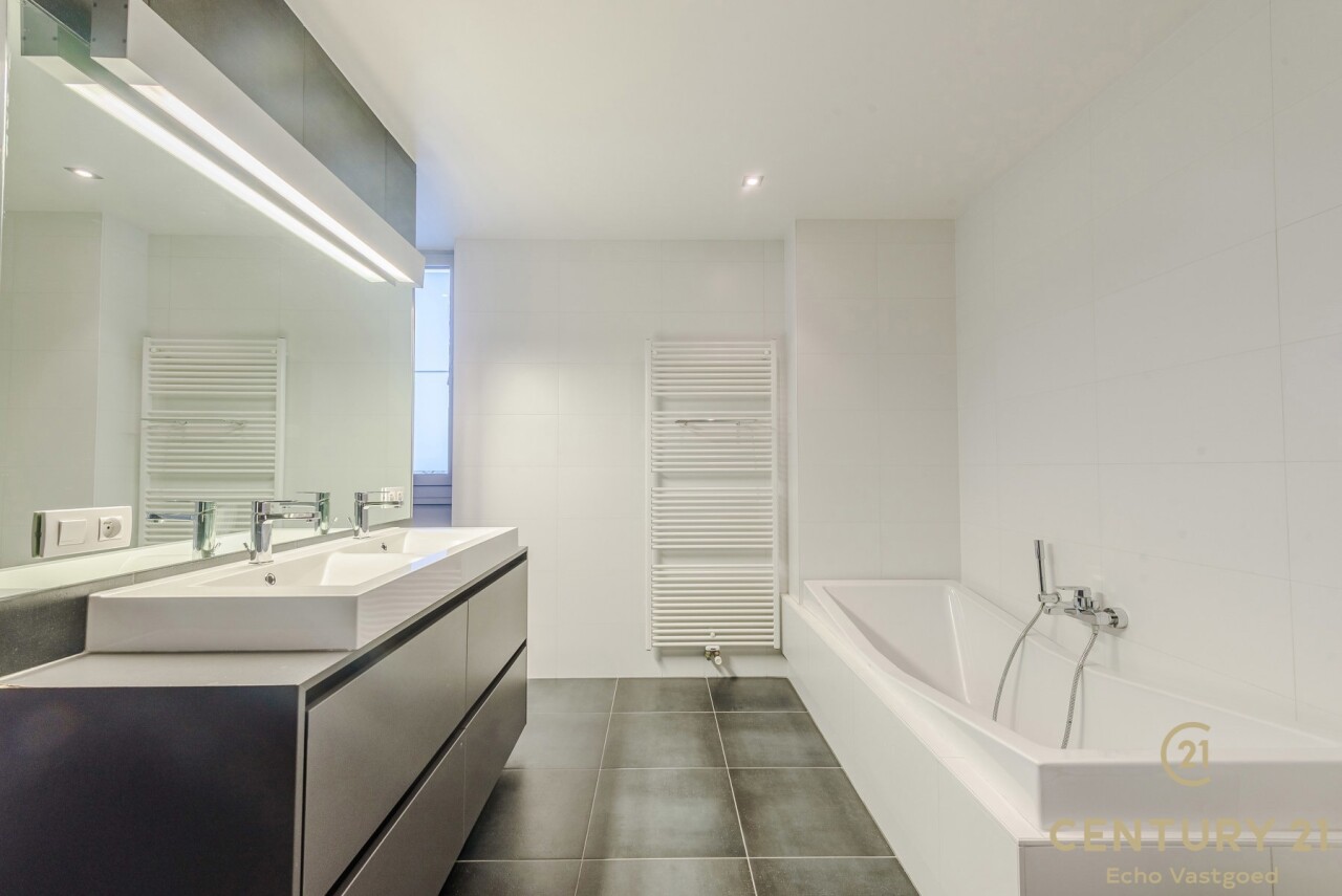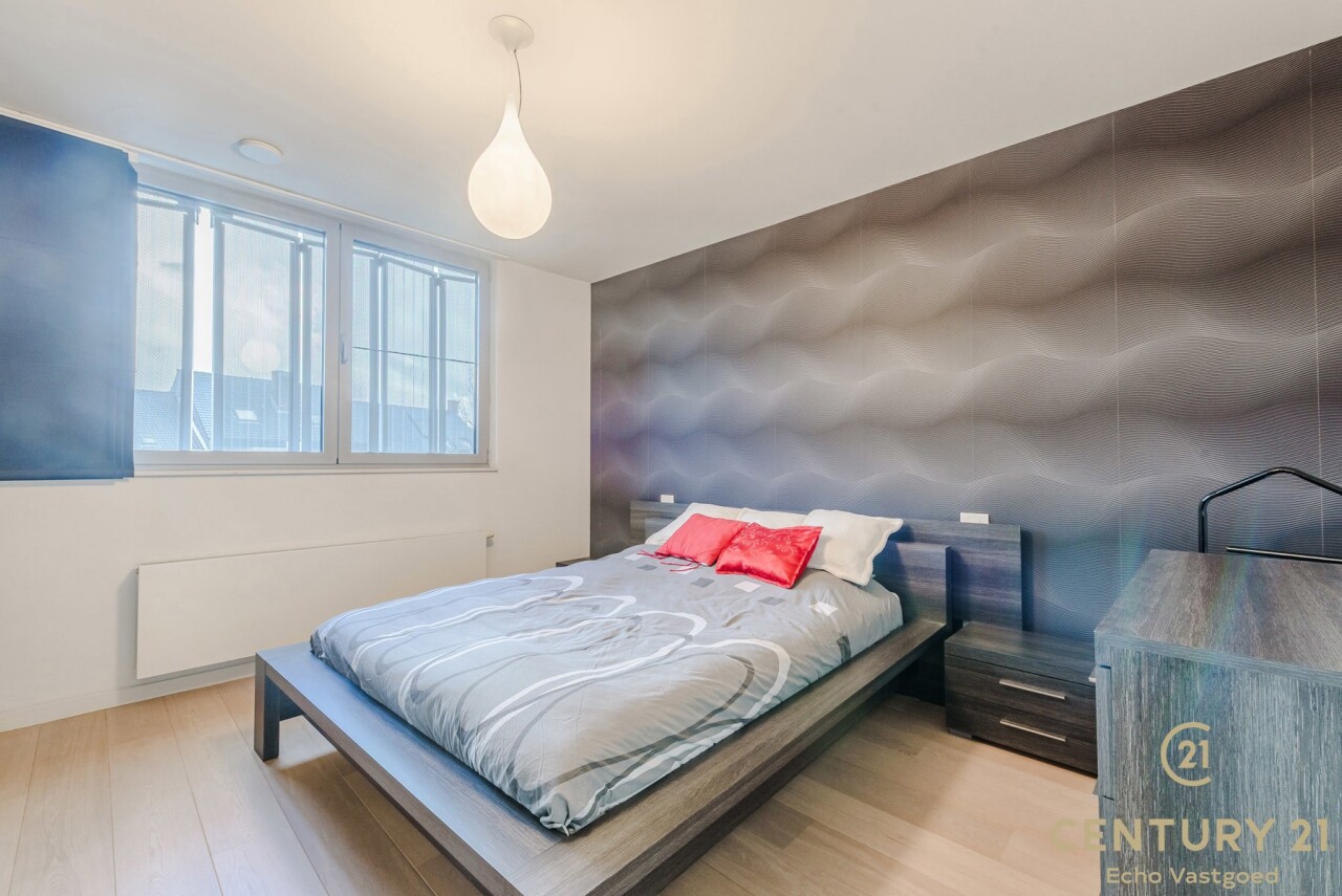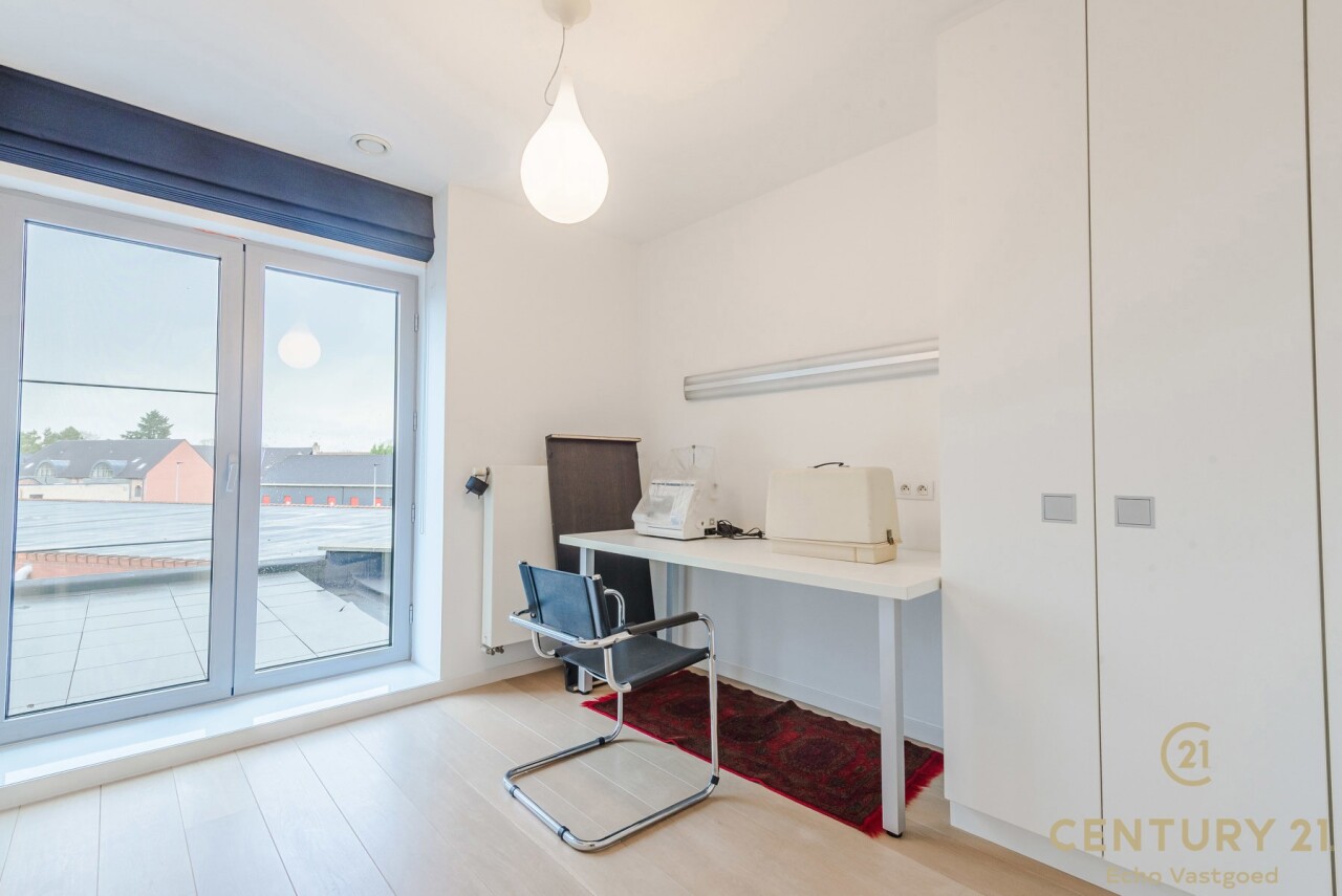 Op de verdieping bevindt zich de leefruimte met een gastentoilet, een moderne en perfect afgewerkte keuken met aansluitende berging en een ruime living met voldoende plaats voor een zithoek, eetruimte en bureau. Aansluitend geniet u van een aangenaam zonneterras.