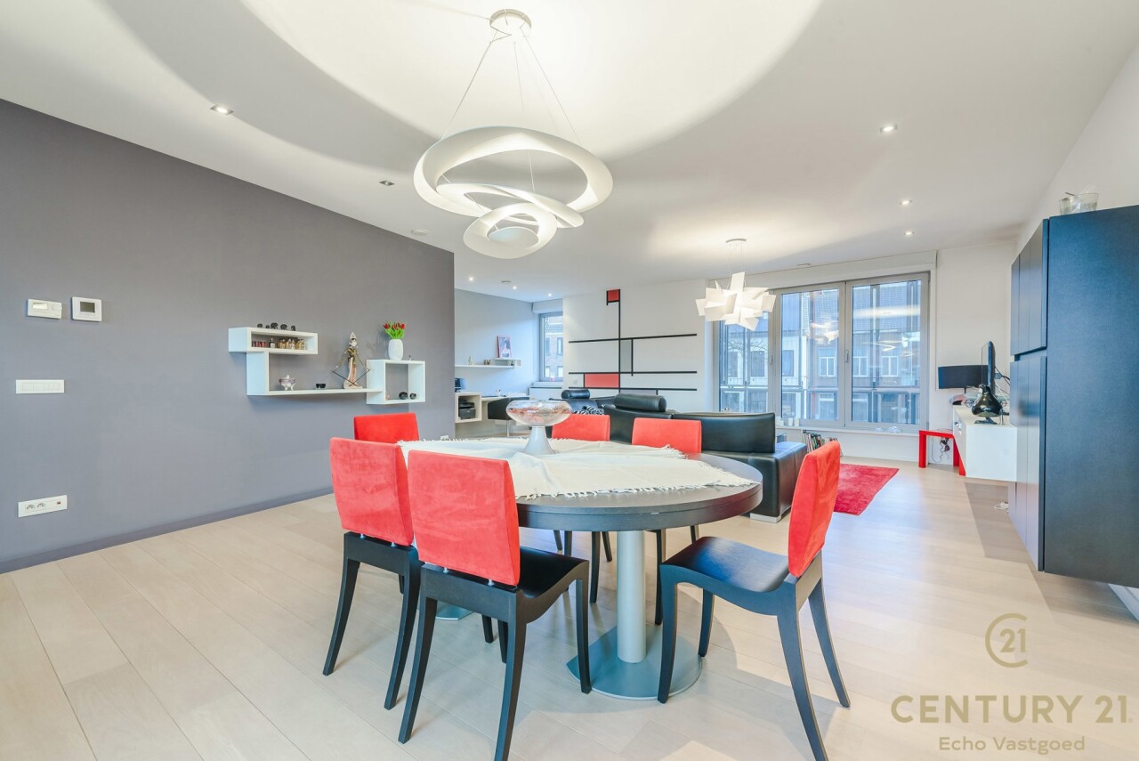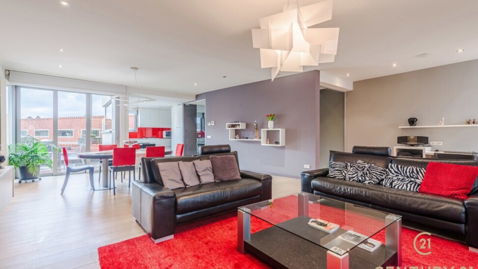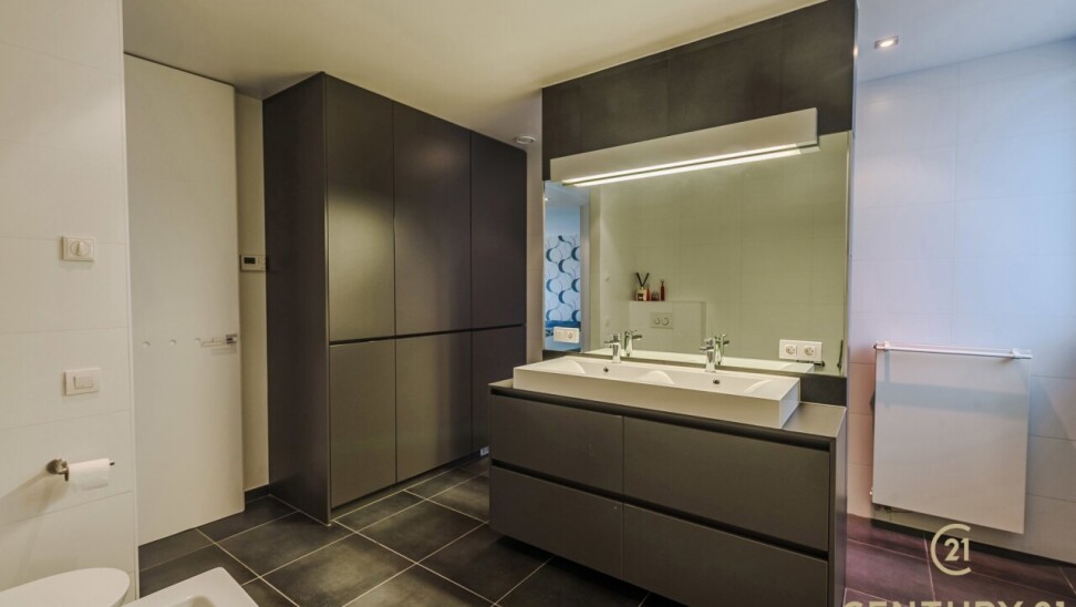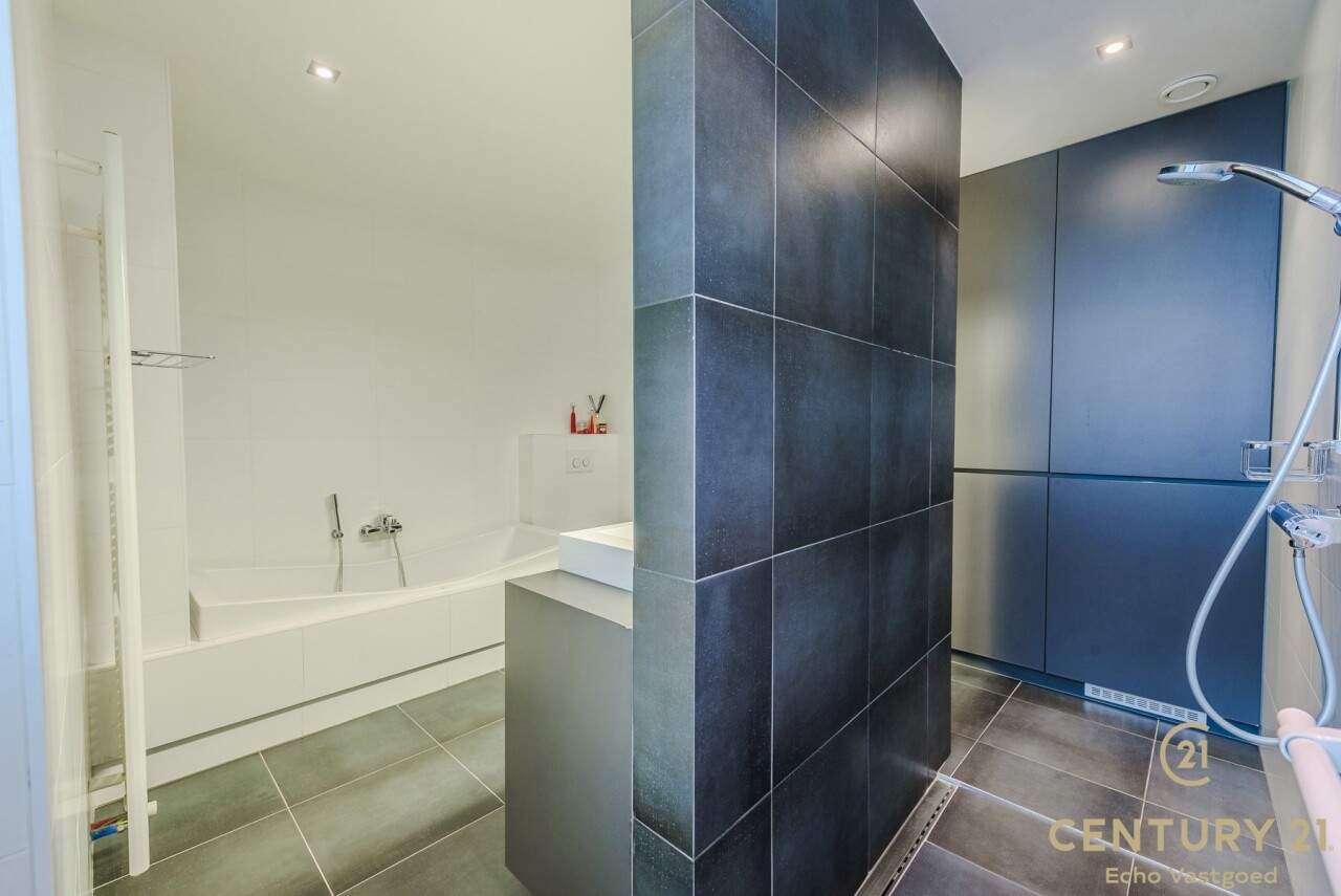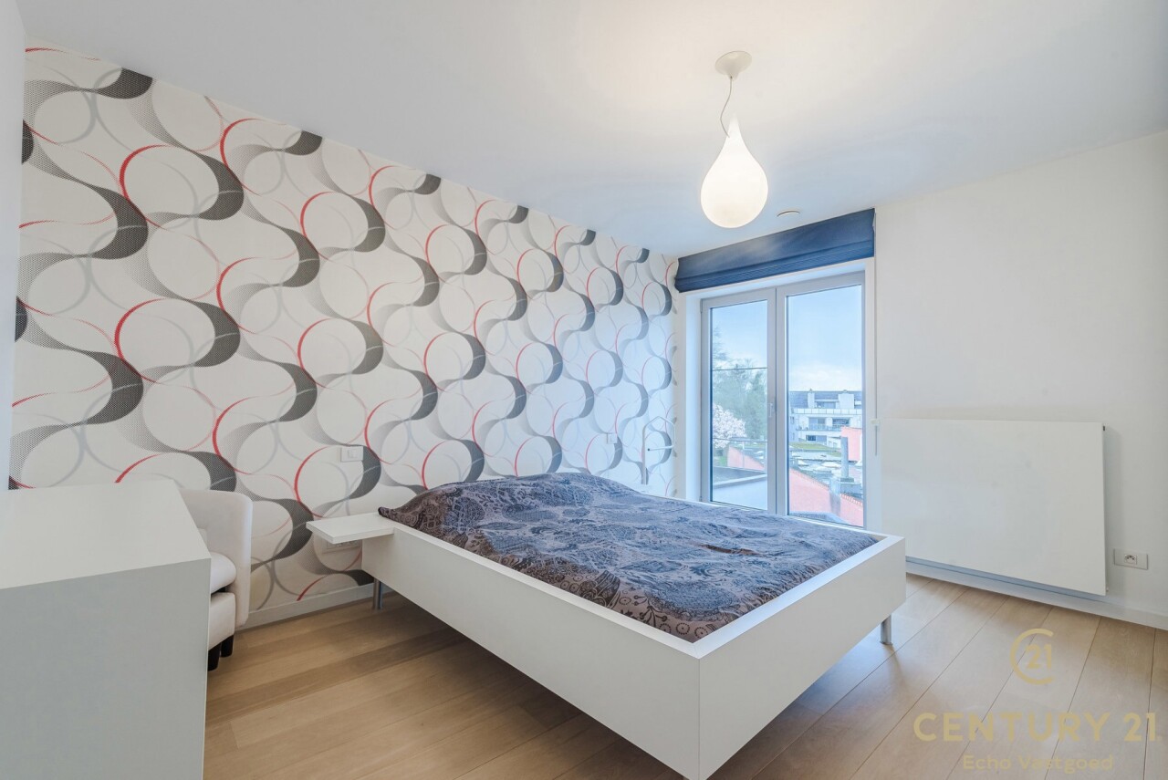 Op de verdieping bevindt zich de leefruimte met een gastentoilet, een moderne en perfect afgewerkte keuken met aansluitende berging en een ruime living met voldoende plaats voor een zithoek, eetruimte en bureau. Aansluitend geniet u van een aangenaam zonneterras.