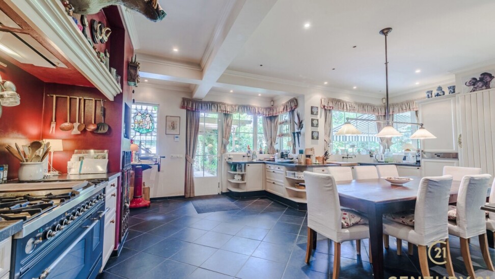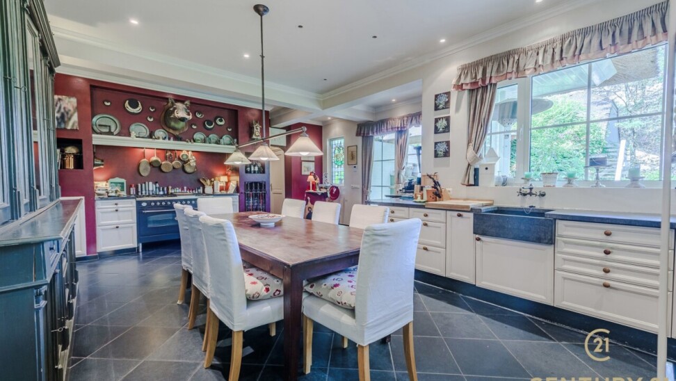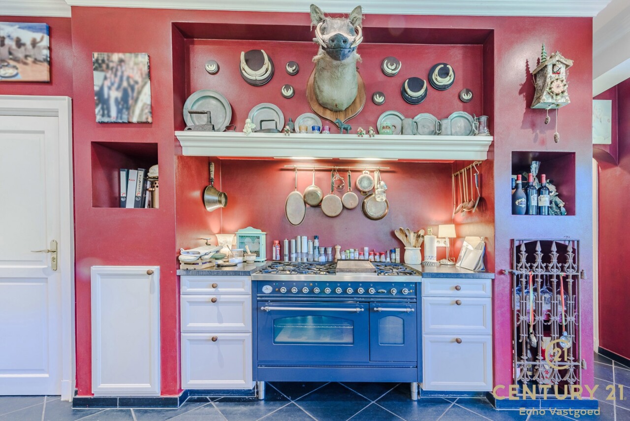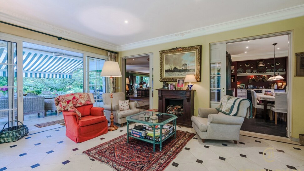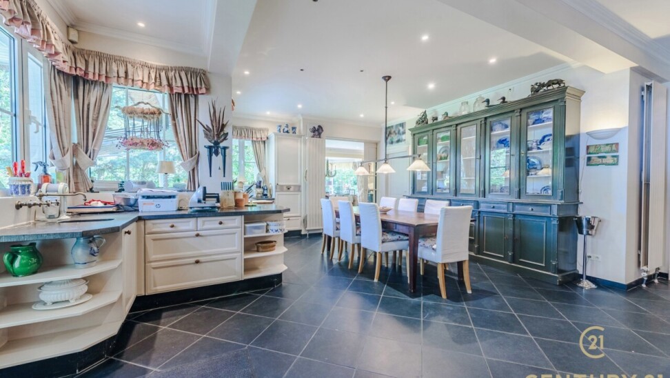 Via de ruime inkomhal met gastentoilet en aparte bureauruimte betreedt u de sfeervolle leefruimte. De gezellige open haard, de brede raampartijen en de naadloze overgang naar de eetkamer zorgen voor een warme, huiselijke sfeer met overal zicht op de prachtige tuin. De volledig uitgeruste keuken is aangenaam ruim en beschikt over een aansluitende berging.