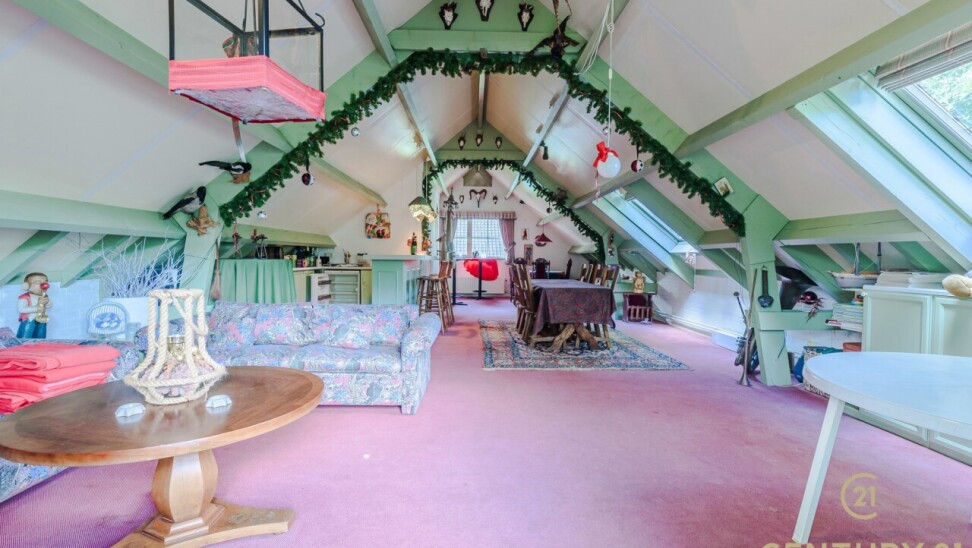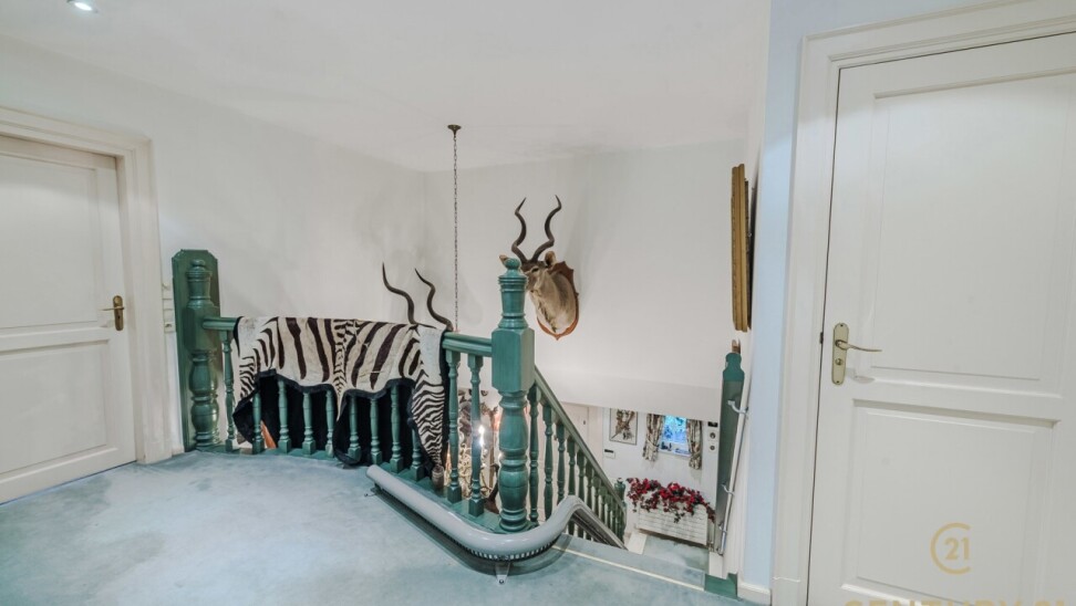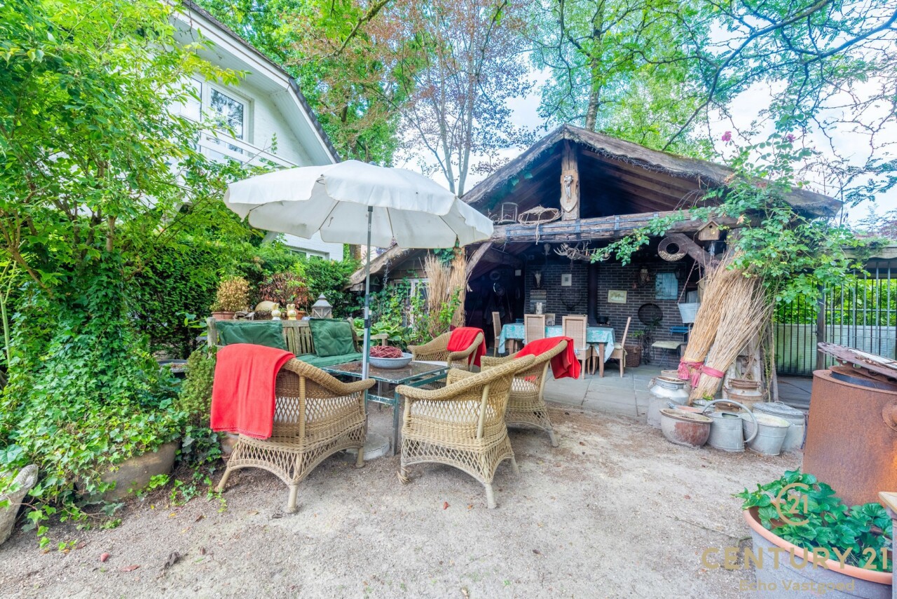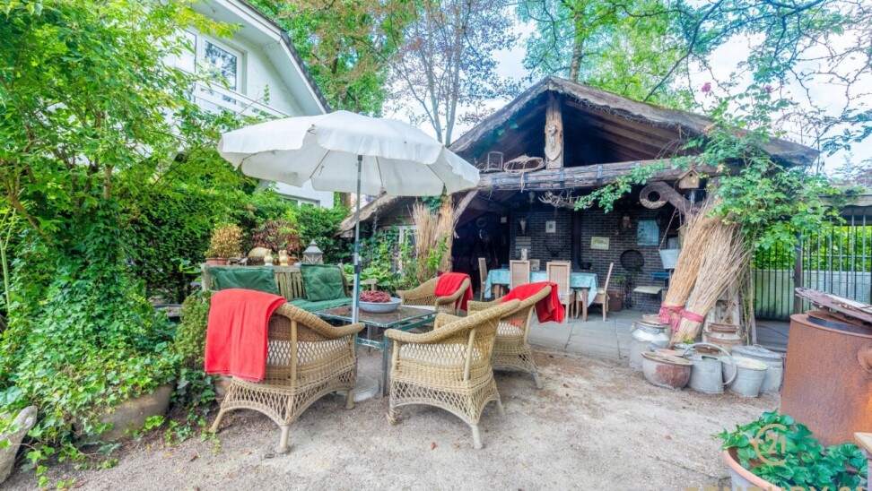Een bijzonder pluspunt is het multifunctionele bijgebouw, dat bestaat uit een ruime garage met drie poorten en meer dan voldoende opbergruimte. De bovenverdieping van dit gebouw is ingericht als hobbyruimte met een gezellige bar, douche en apart toilet – ideaal als gastenverblijf, atelier, of als zelfstandige ruimte voor inwonende tieners of hulp. Deze verdieping is bereikbaar via een aparte buitentrap.