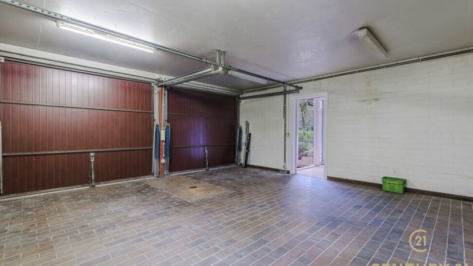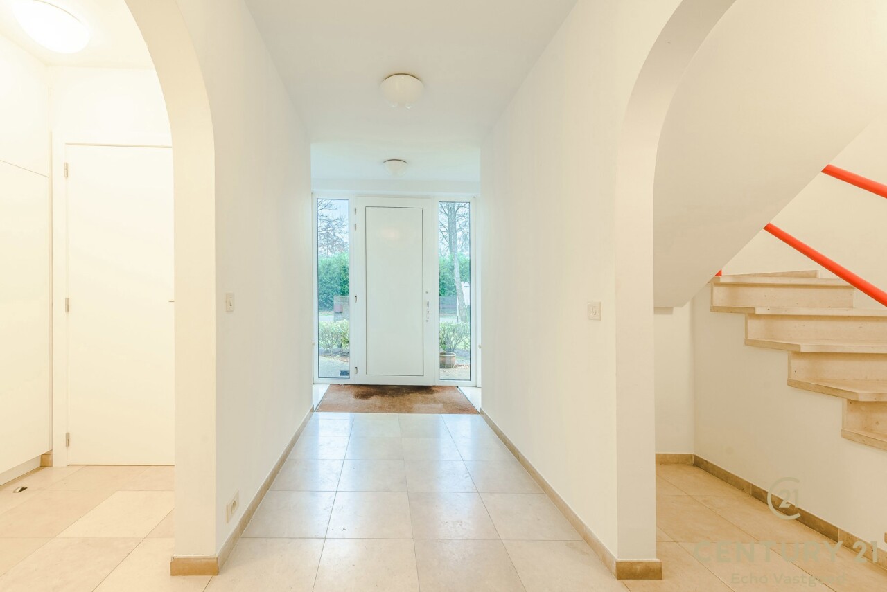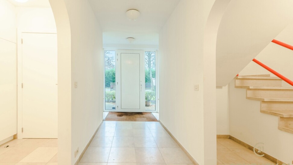 Bij het binnenkomen word je verwelkomd in een stijlvolle, centrale inkomhal met gastentoilet en vestiaire. Links bevindt zich een praktische kantoorruimte—ideaal om rustig te werken van thuis uit—terwijl je rechts toegang hebt tot de dubbele, inpandige garage.