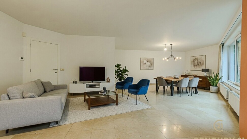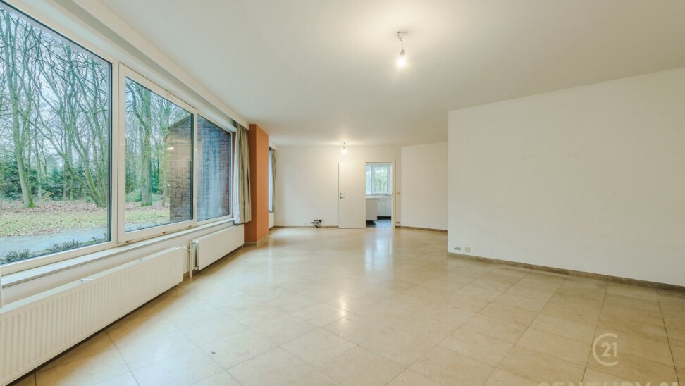 De leefruimtes bevinden zich aan de achterzijde van de woning en baden door de grote raampartijen in een overvloed aan natuurlijk licht. Vanuit zowel de zit- als eethoek heb je een prachtig zicht op de groene tuin. De warme travertinvloer geeft het geheel een elegante en tijdloze uitstraling.