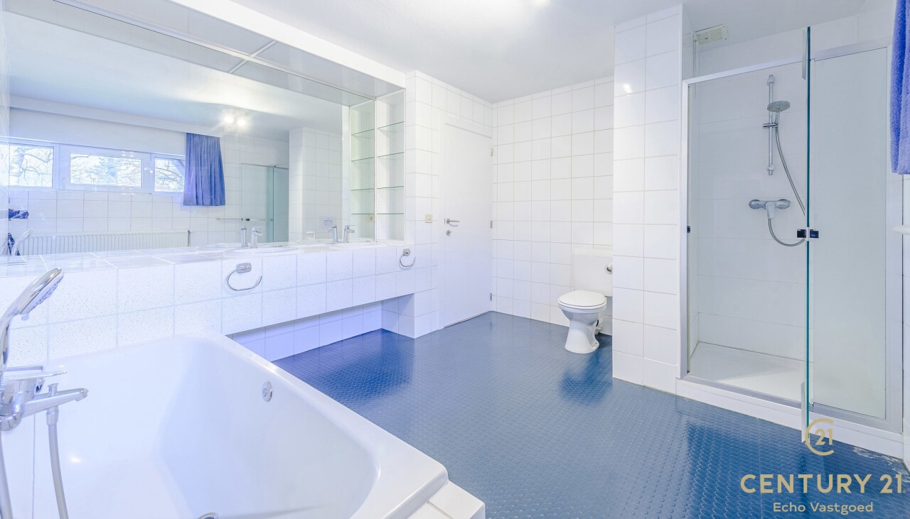 De stijlvolle travertintrap leidt naar de eerste verdieping, waar maar liefst vier ruime slaapkamers te vinden zijn. Drie hiervan zijn uitgerust met een eigen lavabo en bieden toegang tot het achterliggende terras. De vijfde slaapkamer grenst aan de badkamer, die tevens bereikbaar is via de nachthal. De volledig uitgeruste badkamer beschikt over een ligbad, dubbele wastafel, douche en toilet.
