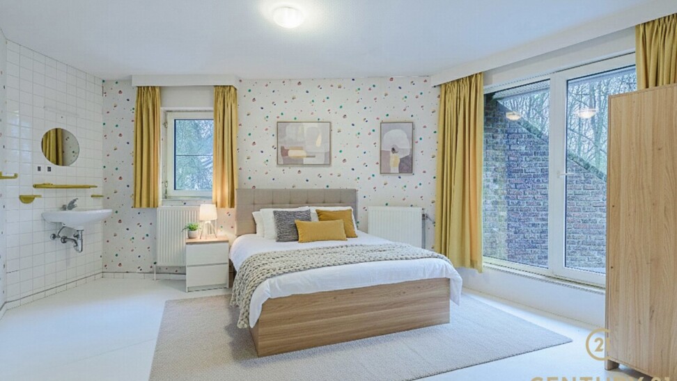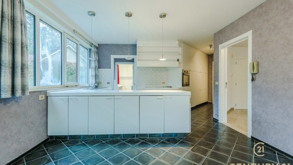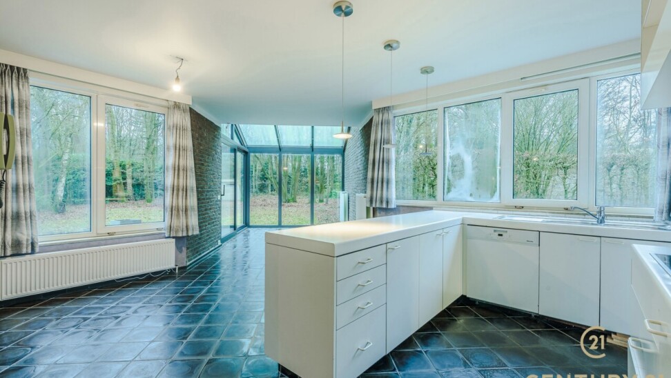 De aangrenzende leefkeuken is uitgerust met kwalitatieve Miele-toestellen en biedt plaats aan een gezellige eethoek. In de aansluitende veranda is het heerlijk ontspannen met zicht op de tuin. Een aparte zij-ingang brengt je naar de wasplaats met douche en een extra bergruimte—ideaal voor gezinnen die houden van orde en functionaliteit.